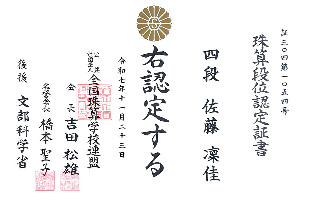 2025/12/21 2025年11月 珠算・暗算検定 合格おめでとう!
