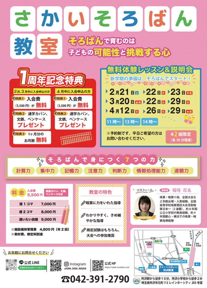 只今さかいそろばん教室では、入学料無料の「春の入学キャンペーン」を開催中です(4/30日まで)※各教室先着10名まで。
