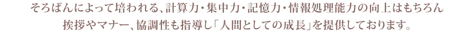 指導にあたる講師は、珠算と暗算十段の最高位が直接一人一人を指導いたします。どうすれば早く解けるのか?暗算の上達法、珠算の上達法などのコツも交えて指導にあたります。またそろばんは近年「脳の活性化」に最適であると脚光を浴びています。能力(脳力)アップのツールとして、 そろばんは究極の習い事です。また並行して子供たちに人気の「フラッシュ暗算」や「脳トレ」なども授業に盛りこまれております。