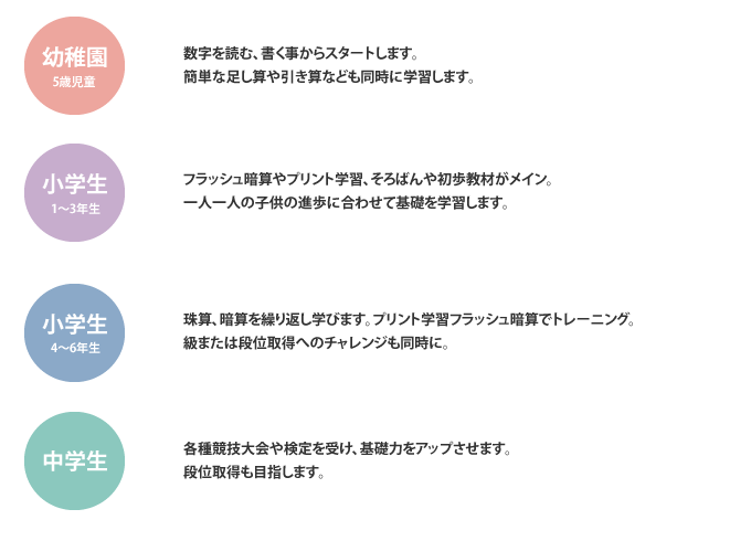 お子様一人一人の年齢や能力に沿って「楽しく学ぶ」という学習法を憶えることで、子どもたちが率先して、自分の興味や暗算や珠算を自分なりに研究して、最終的には「自ら学ぶ」いう指導を行っております。それぞれ個性のある子どもたちの「好き」をどう引き出すか、どう楽しんで学んでもらうかということを日々考えております。毎週短時間の授業ですが、さかいそろばん教室に通うことで、子どもたちの学習するヒントを養えればと思っております。