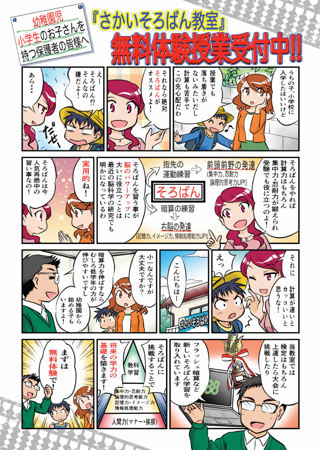 近年、そろばんは脳を活性化させ、子どもの計算能力、記憶力、集中力、忍耐力、想像力、情報処理能力などを向上させるため、基礎教育として見直されています。また、さかいそろばん教室では挨拶やマナー、協調生も指導し『生きる力(人間としての成長)』を提供しております。