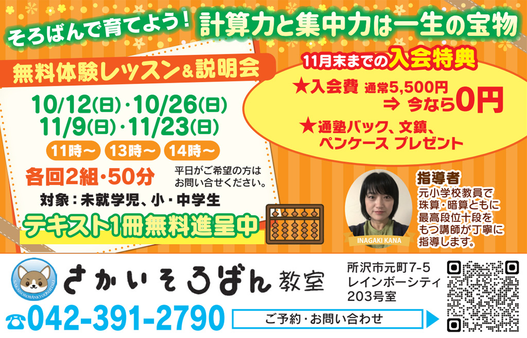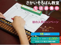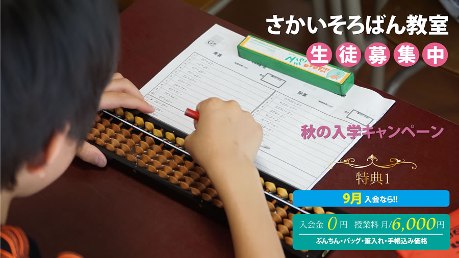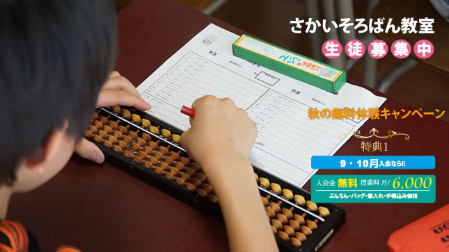 「生きる力を育てよう」をコンセプトとするさかいそろばん教室では、秋の入学キャンペーン期間中に入学していただいた方には入会特典をプレゼントします!