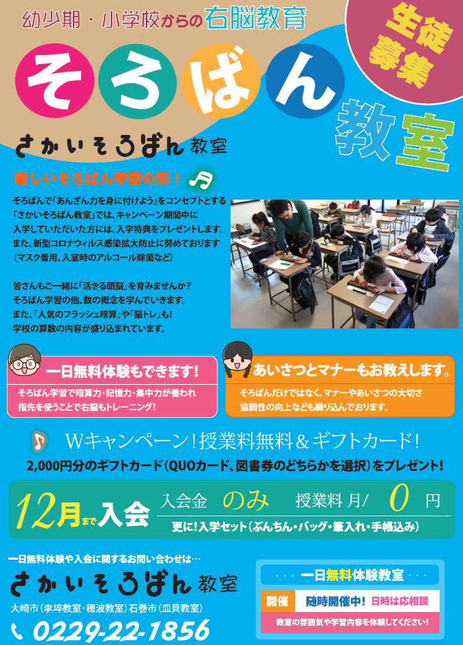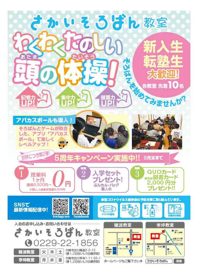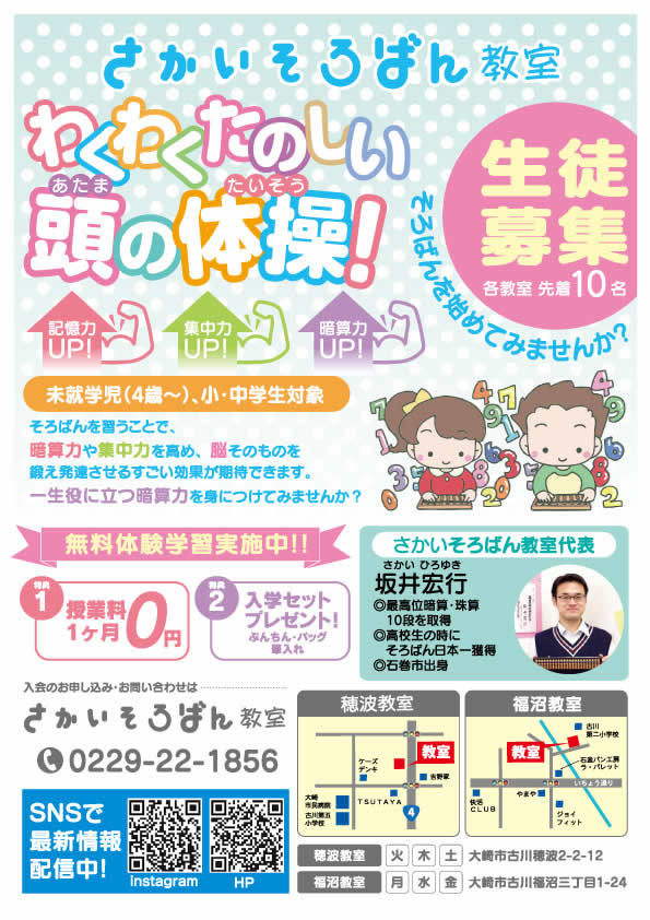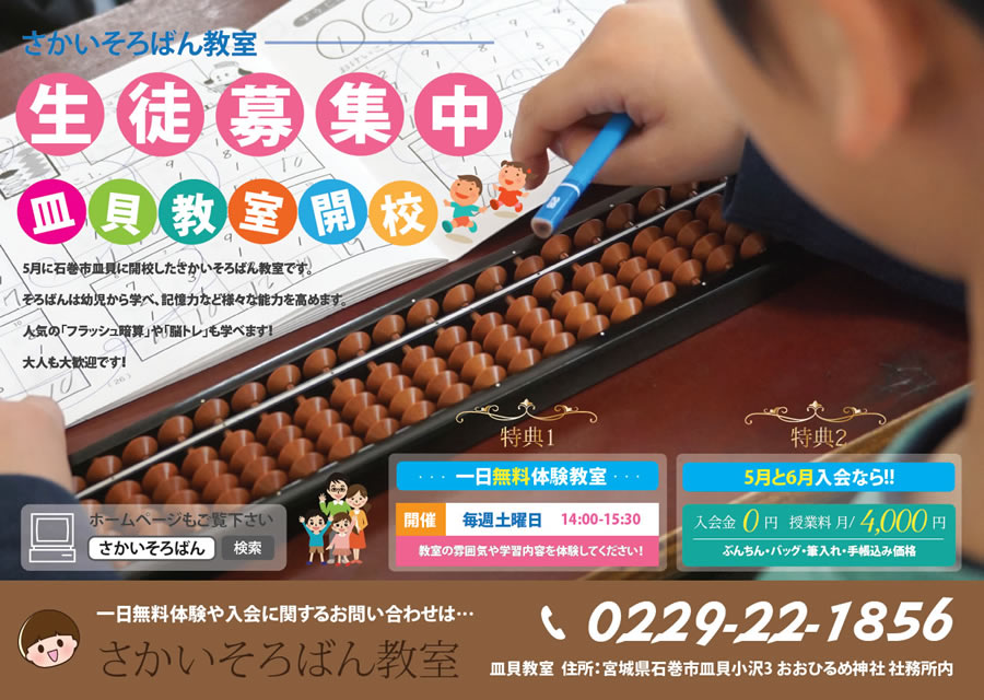 5月に石巻市皿貝に開校いたします。そろばんは幼児から学べ、記憶力など様々な能力を高めます。人気の「フラッシュ暗算」や「脳トレ」も学べます!