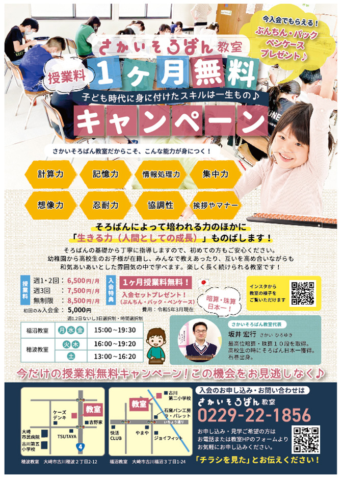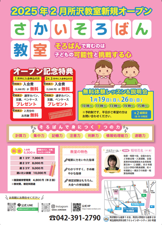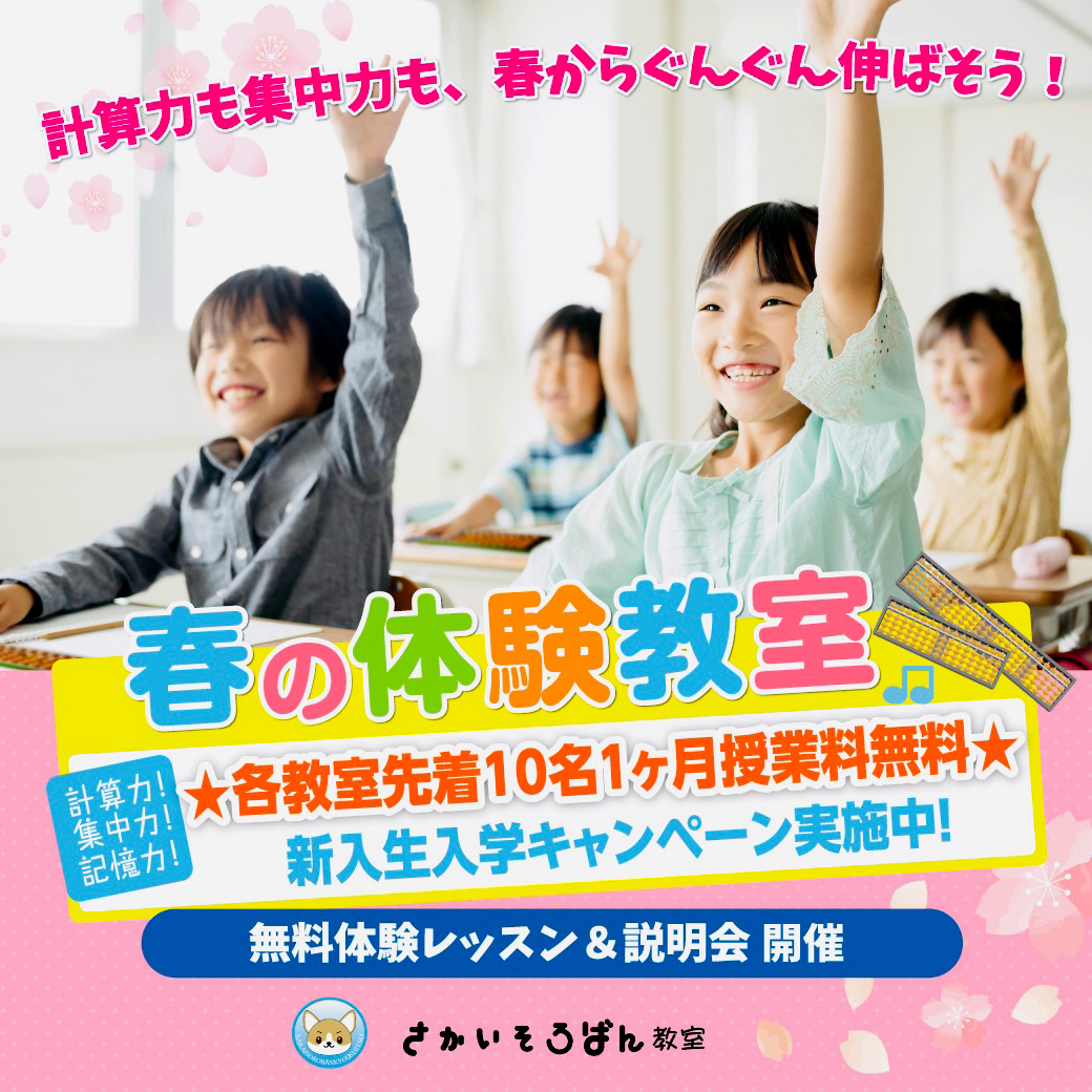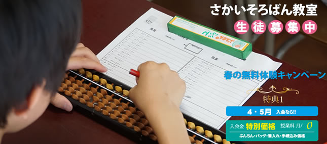 只今さかいそろばん教室では、入学料無料の「春の入学キャンペーン」を開催中です(4/30日まで)※各教室先着10名まで。